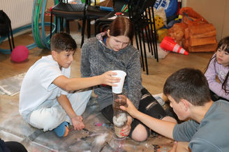 Heute morgen sind wir mit verschiedenen Stationen gestartet. Von Wasserfiltern über Boote bauen, Bügelperlenbilder, Schrumpffolie, bis zu Postkarten schreiben, Öllampe und Wetterfahnen war alles dabei und so haben wir den ersten Teil des Regentages gut rumgebracht.