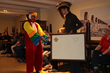 Und dann wurde das Thema des Lagers eröffnet: Piraten! Der Piratenkönig und sein Papagei haben sich um den letzten Keks in der Keksdose gestritten und aus Frust hat der Papagei die wichtige Karte des Piratenkönigs zerrissen und die Kartenstücke über unserem Ort verteilt. Zwei Piratenkinder, entsant vom Piratenkönig, müssen nun die nächsten zwei Wochen die Karte wieder vervollständigen. Und dabei soll nun die gerade angekomme Reisegruppe der KjG Herz-Jesu Neumühl helfen. Nach diesem langen und informativen Tag haben wir uns alle noch eine Gute Nacht gewünscht und uns in die erste Nacht in den noch fremden Betten begeben, voller Vorfreude auf die kommenden Tage und mit Zuversicht, dass wir die Karte wieder vollständig dem Piratenkönig üvergeben zu können.