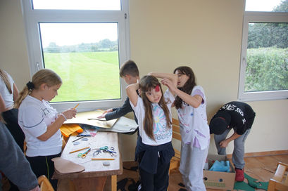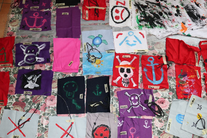 Also sind wir losgestiefelt, haben viele Fotos gemacht und am Schluss hat und der Papagei noch verraten, wo wir suchen sollen. Und was haben wir da gefunden? Gleich zwei Kartenstücke, womit wir jetzt schon drei zusammen haben. Nachdem wir uns gestärkt und etwas ausgeruht haben, haben wir uns noch um unsere Piratenausrüstung gekümmert. Wir haben unsere weißen Tshirts piratenmäßig gestaltet, Hüte, Augenklappen und Sammeltaschen gebastelt und wilde Piratenmusik dabei gehört. Damit haben wir den regnerischen Nachmittag gut überstanden und am Abend einen Wortgottesdienst gehalten. Darin haben wir gelernt, dass wir alle unser eigener Schatz sind.
