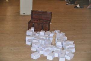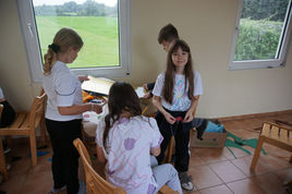 Also sind wir losgestiefelt, haben viele Fotos gemacht und am Schluss hat und der Papagei noch verraten, wo wir suchen sollen. Und was haben wir da gefunden? Gleich zwei Kartenstücke, womit wir jetzt schon drei zusammen haben. Nachdem wir uns gestärkt und etwas ausgeruht haben, haben wir uns noch um unsere Piratenausrüstung gekümmert. Wir haben unsere weißen Tshirts piratenmäßig gestaltet, Hüte, Augenklappen und Sammeltaschen gebastelt und wilde Piratenmusik dabei gehört. Damit haben wir den regnerischen Nachmittag gut überstanden und am Abend einen Wortgottesdienst gehalten. Darin haben wir gelernt, dass wir alle unser eigener Schatz sind.